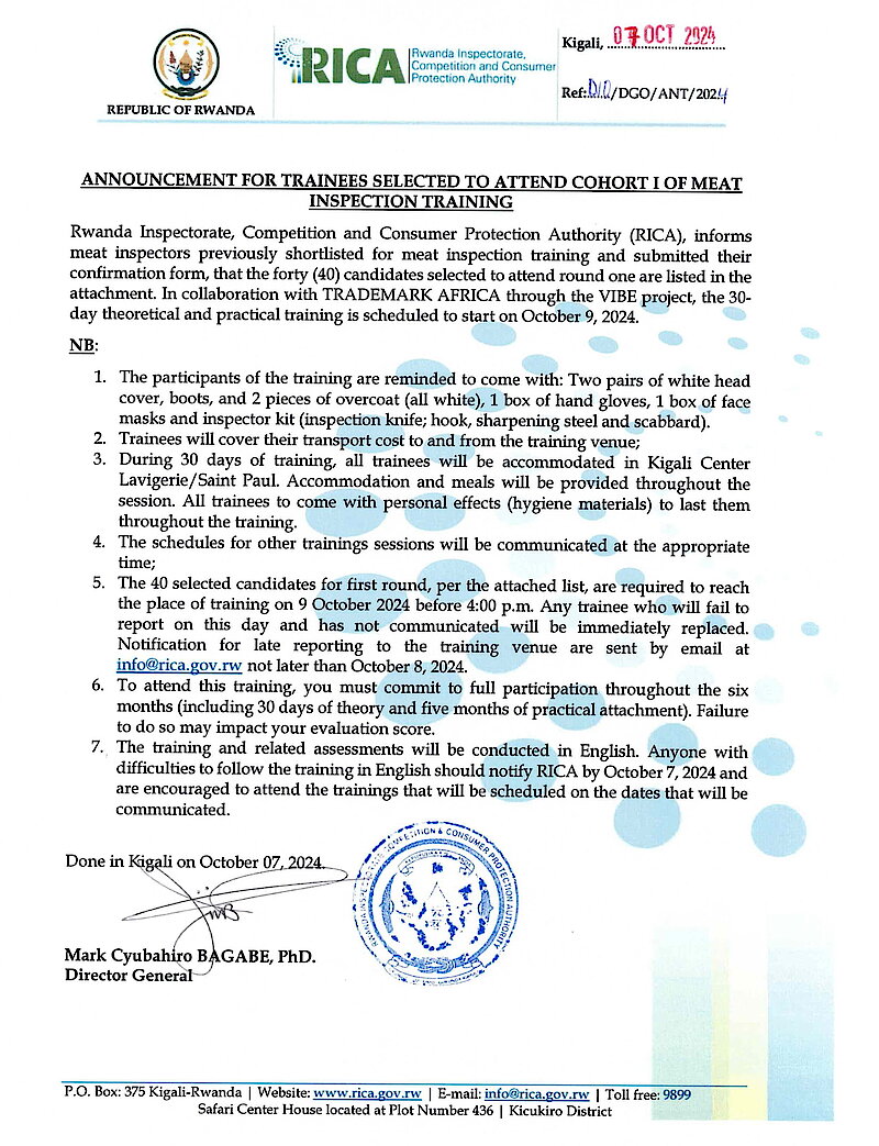 ANNOUNCEMENT FOR TRAINEES SELECTED TO ATTEND COHORT I OF MEAT INSPECTION TRAINING
